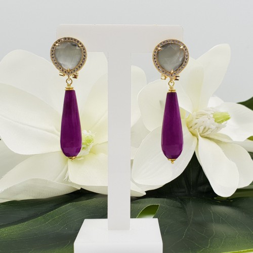 Mooie oorbellen met goud kleurige steker (nikkelvrij) gezet met grijze Kattenoog en fuchsia roze druppel.