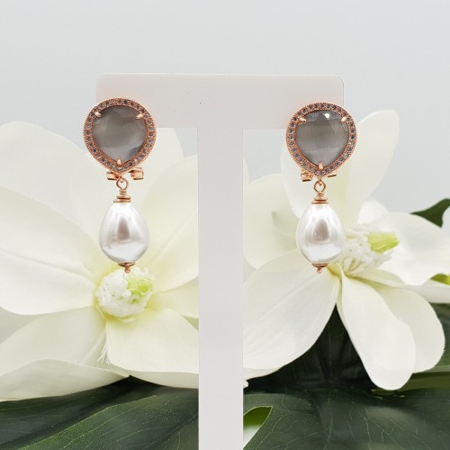Mooie oorbellen met goud kleurige steker (nikkelvrij) gezet met grijze Kattenoog en Parel.