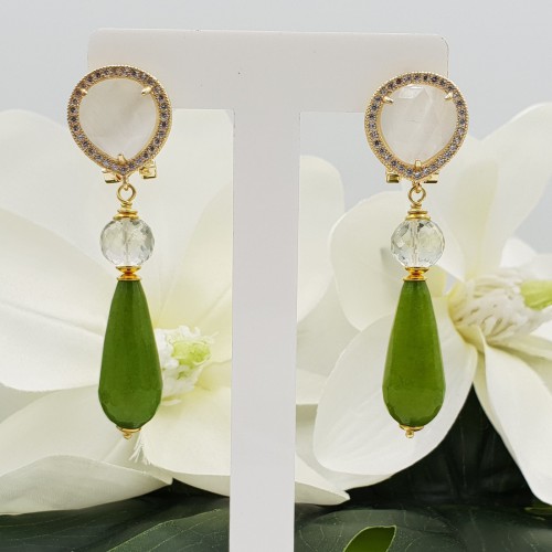 Mooie goud kleurige oorknoppen (nikkelvrij) gezet met witte Kattenoog, en groene Amethist en groene Jade.
