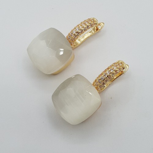 Vergulde oorbellen met oorhaakje (goud over messing) gezet met gele Kattenoog, en druppel van kirstallen en Tijgeroog.