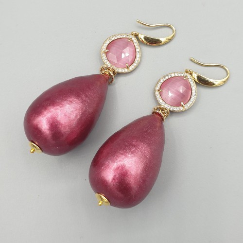 Vergulde (over messing) oorbellen met grote druppel van roze kristallen en Kattenoog.