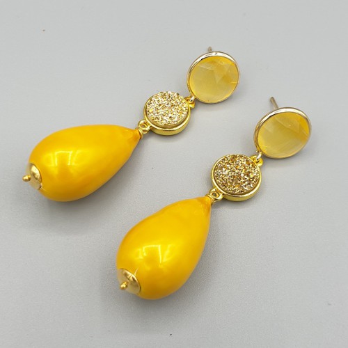 Vergulde (over messing) oorbellen met gele Katoen Parel en gele Kattenoog.