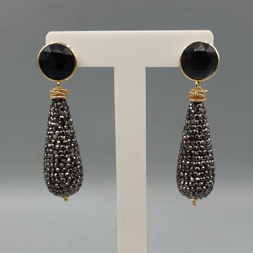 Vergulde (over messing) oorbellen met zwarte Kattenoog en zwarte Onyx.