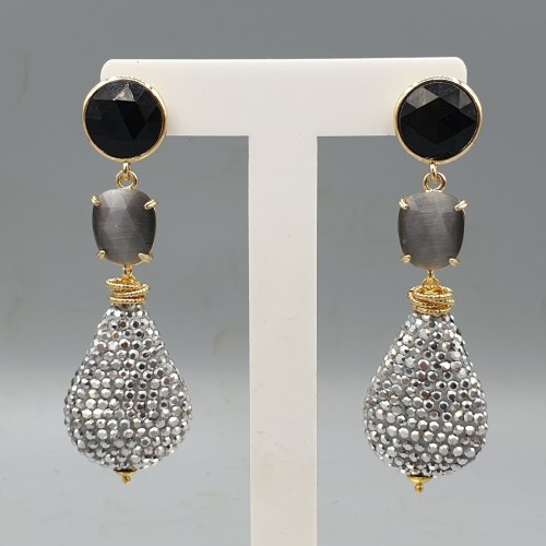 Vergulde (over messing) oorbellen met Markasiet en zwarte Kattenoog