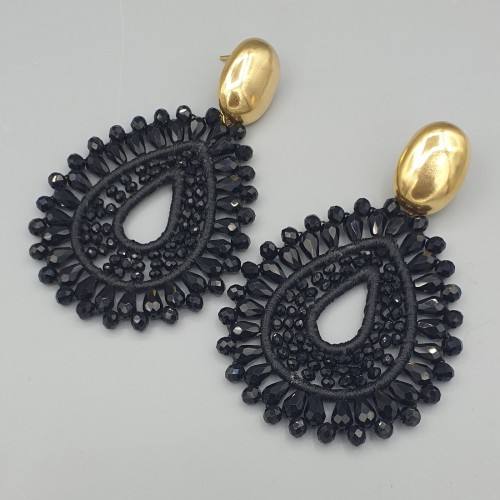 Handgemaakte vergulde oorbellen met druppelvormige zwarte hanger.