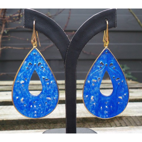 Mooie Vergulde (over Sterling zilver) oorbellen grote uitgesneden blauwe Jade druppel in omlijsting.