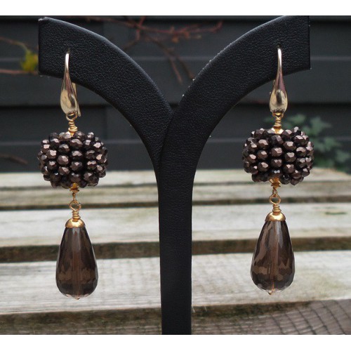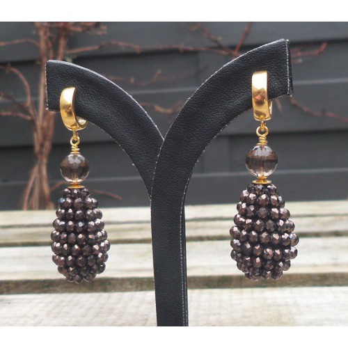 Mooie Vergulde (over Sterling zilver) oorbellen met bollen van kleine facet geslepen bruine kristallen en Smokey Topaas briolet.