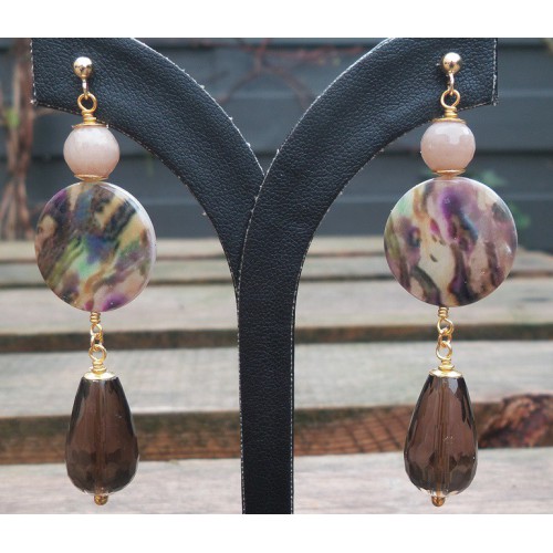 Mooie Vergulde (over Sterling zilver) oorbellen met Blacklip schelp, Citrien en Smokey Topaas.