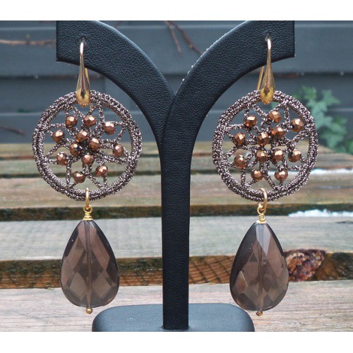 Mooie Vergulde (over Sterling zilver) oorbellen met grote Smokey Topaas briolet en ring van zijdraad en kristallen.