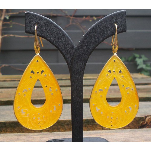 Mooie Vergulde (over Sterling zilver) oorbellen grote uitgesneden oranje Jade druppel in omlijsting.