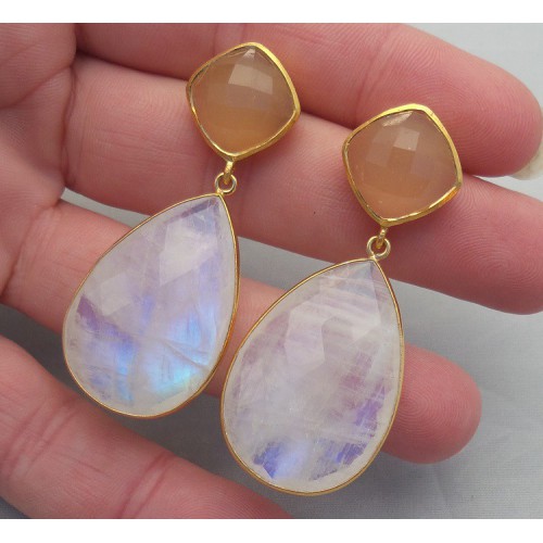 Mooie Vergulde (over Sterling zilver) oorbellen met perzik Chalcedoon en regenboog Maansteen briolet.