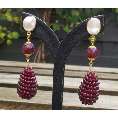Mooie Vergulde (over Sterling zilver) oorbellen met druppel van facet geslepen Granaten, ronde Robijn en Parel.