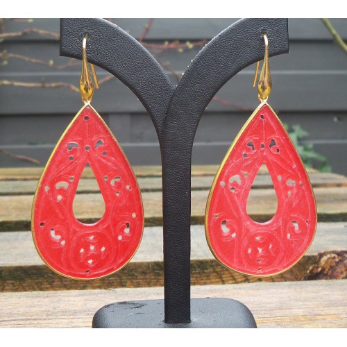 Mooie Vergulde (over Sterling zilver) oorbellen grote uitgesneden rode Jade druppel in omlijsting.
