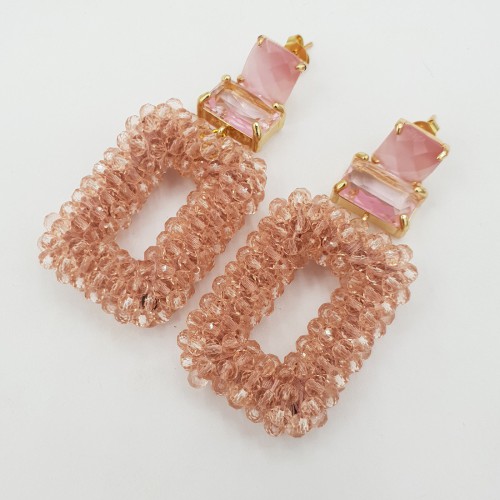 Vergulde (over messing) oorbellen met rechthoekige hanger mixed roze kristallen.