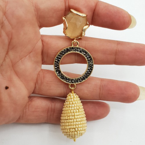 Vergulde (over Sterling zilver) oorbellen met rechthoekige hanger van beige kristallen en Kattenoog.