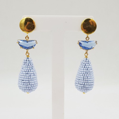 Vergulde (over messing) oorbellen met rechthoekige hanger mixed blauwe kristallen.