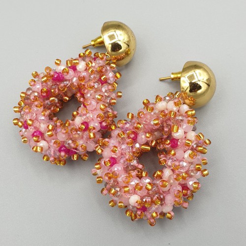 Vergulde (over messing) oorbellen met bol van mixed roze kristallen.