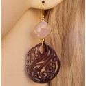 Mooie Vergulde (over Sterling zilver) oorbellen met roze Chalcedoon en uitgesneden bruine schelp.
