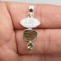 925 Sterling zilveren hanger gezet met Moldaviet, regenboog Maansteen en groene Toermalijn.