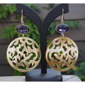 Mooie Sterling zilveren oorbellen met uitgesneden Buffelhoorn en dwarsliggende ovale Amethist.